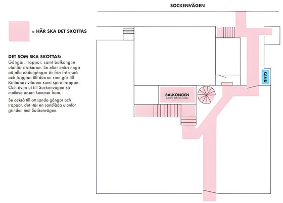 Alla medlemmar hjälps åt med snöskottning och sandning av gården, samt gå iväg med återvinning. Varje familj får en eller två veckor per år tilldelade enligt ett schema som mailas ut till medlemmarna.